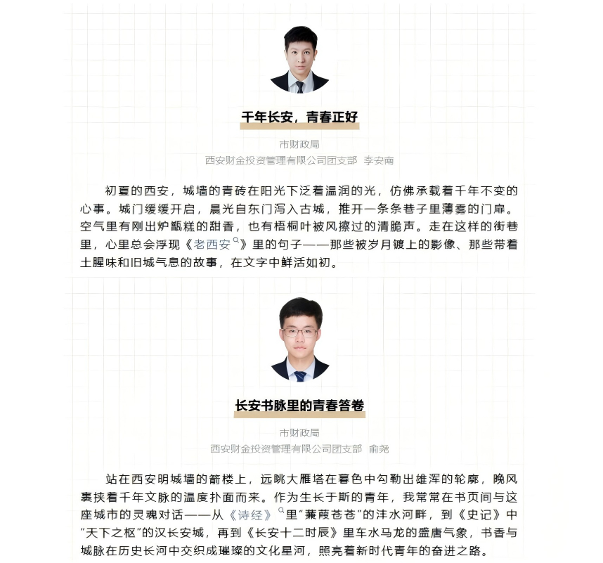 近日,在市直机关团工委组织开展的“书香长安 闪耀青春”读书征文活动中,由西安市财政局报送的西安财金团支部征文作品脱颖而出,其中,李安南撰写的《千年长安,青春正好》和俞尧撰写的《长安书脉里的青春答卷》等两篇作品被评为优秀征文,并在西安机关党建微信公众号上予以展示。